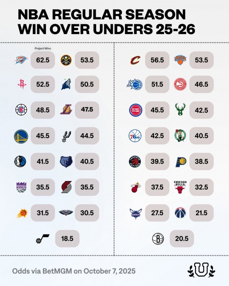 10月8日讯 博彩公司BetMGM给出了新赛季NBA各队常规赛的胜场盘口指数,其中雷霆的胜场盘口指数为62.5,是所有球队中最高的。这可以大致理解为博彩公司认为雷霆的胜场数最有可能就是62、63场这几个接近的数字。