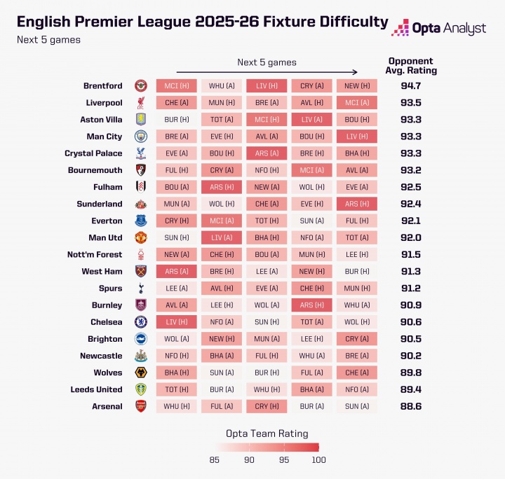 布伦特福德未来五个对手的平均评分高达94.7,位居各队之首。其赛程依次为:主场迎战曼城、客场挑战西汉姆联、主场对阵利物浦、客场对阵水晶宫,最后回到主场迎战纽卡。