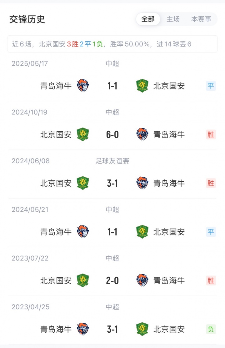 积分榜方面,国安目前15胜6平6负,积51分排在积分榜第四位;海牛则是3胜9平15负积18分排在倒数第一,双方本赛季首回合交手,海牛主场1-1战平国安。